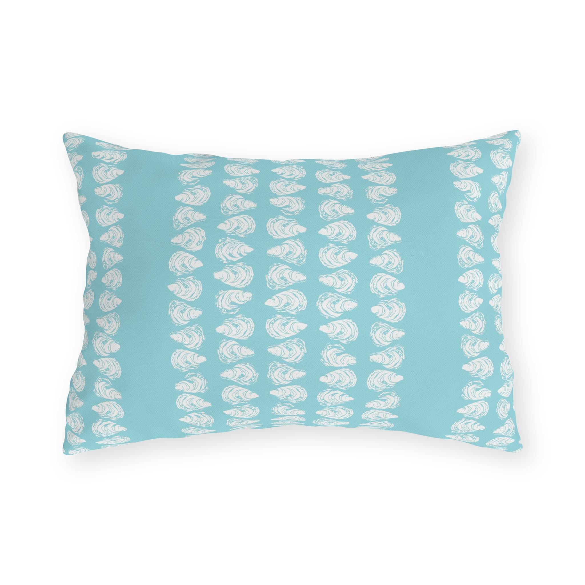 This lumbar pillow features aqua oysters arranged in a mandala pattern, on a white background. The pillow's back has a bold design of white oysters on an aqua background, to add a graphic punch to your decor. Both sides will complement all of your Sea Foam Collection pieces and create a multi-layered look. The pillow measures 14" wide by 20" long, and the insert is included. The pillows are UV-resistant so you can count on the printed colors to stay vibrant for a long time to come. Additionally, their water and mildew-resistant nature make them the perfect candidates for carefree decorating. These pillows are made to order and shipped from within the USA. Free shipping within the USA.