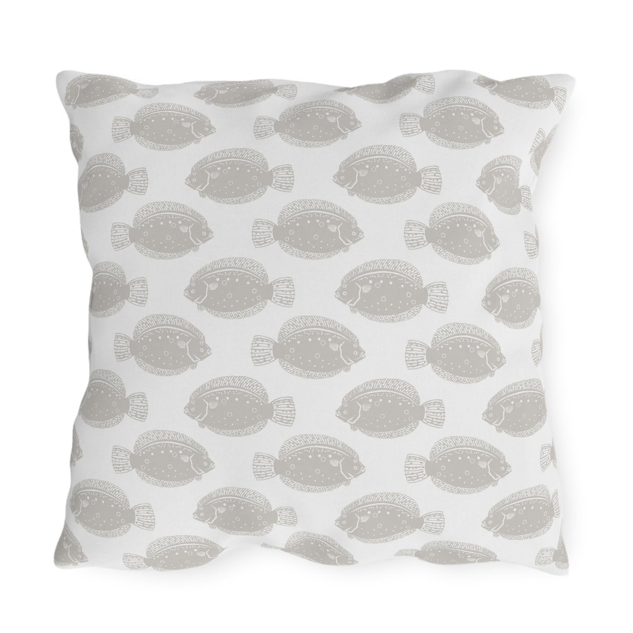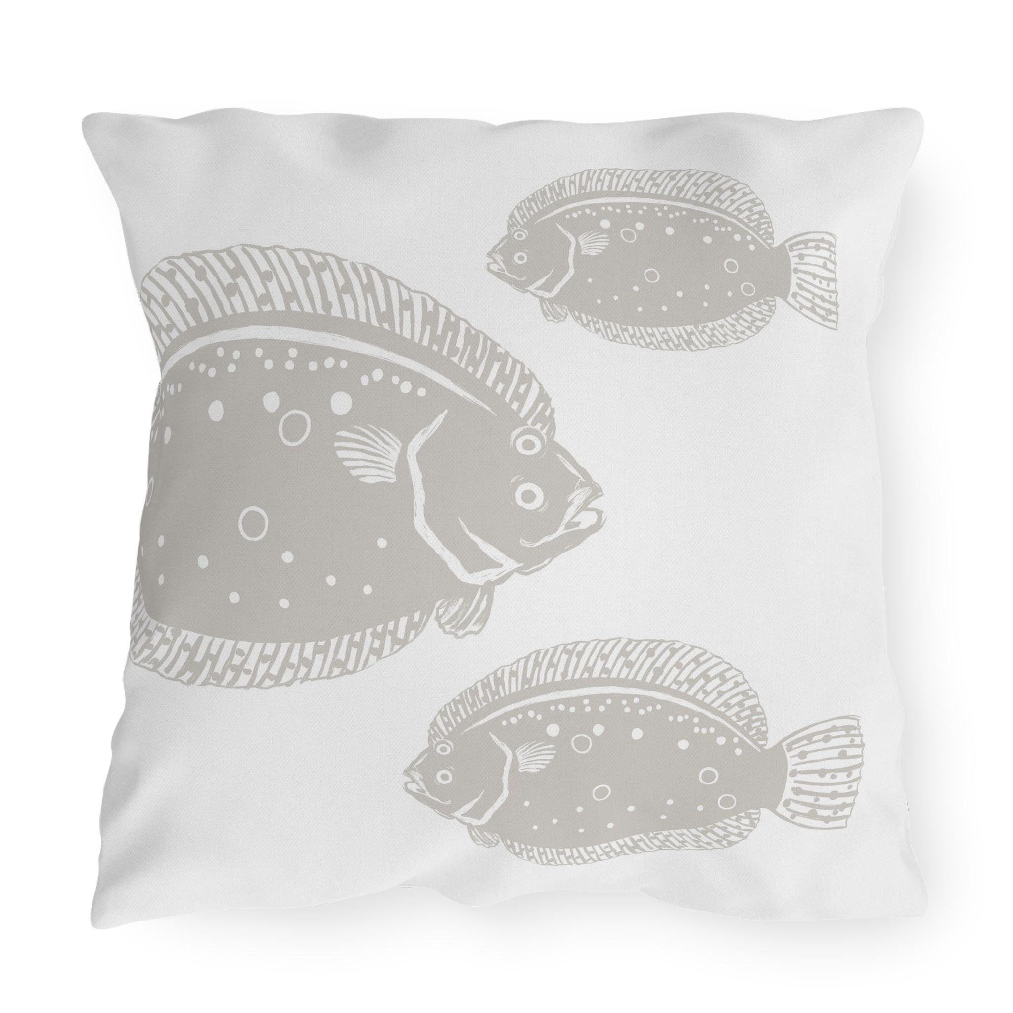 Bring a calm, coastal mood to your porch, patio, or sunroom with these outdoor pillows. The flounder motif, in a warm sandy gray, drifts across a clean white background. This pillow coordinates with all the Sea Foam collection colors. Lightweight but sturdy, the cushions hold their shape and show off crisp, double-sided prints that stand up to sun and splash. Tuck one into a rattan chair, layer a few on a bench for relaxed seaside styling, or pile them on a sofa for slow afternoons with a book and the sound of waves. Printed to order in the USA exclusively for Anondi; free shipping included for all orders within the USA.