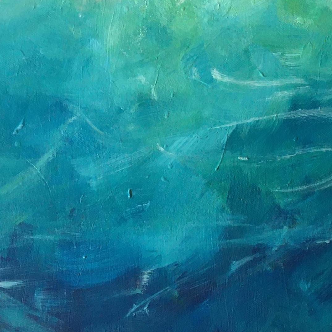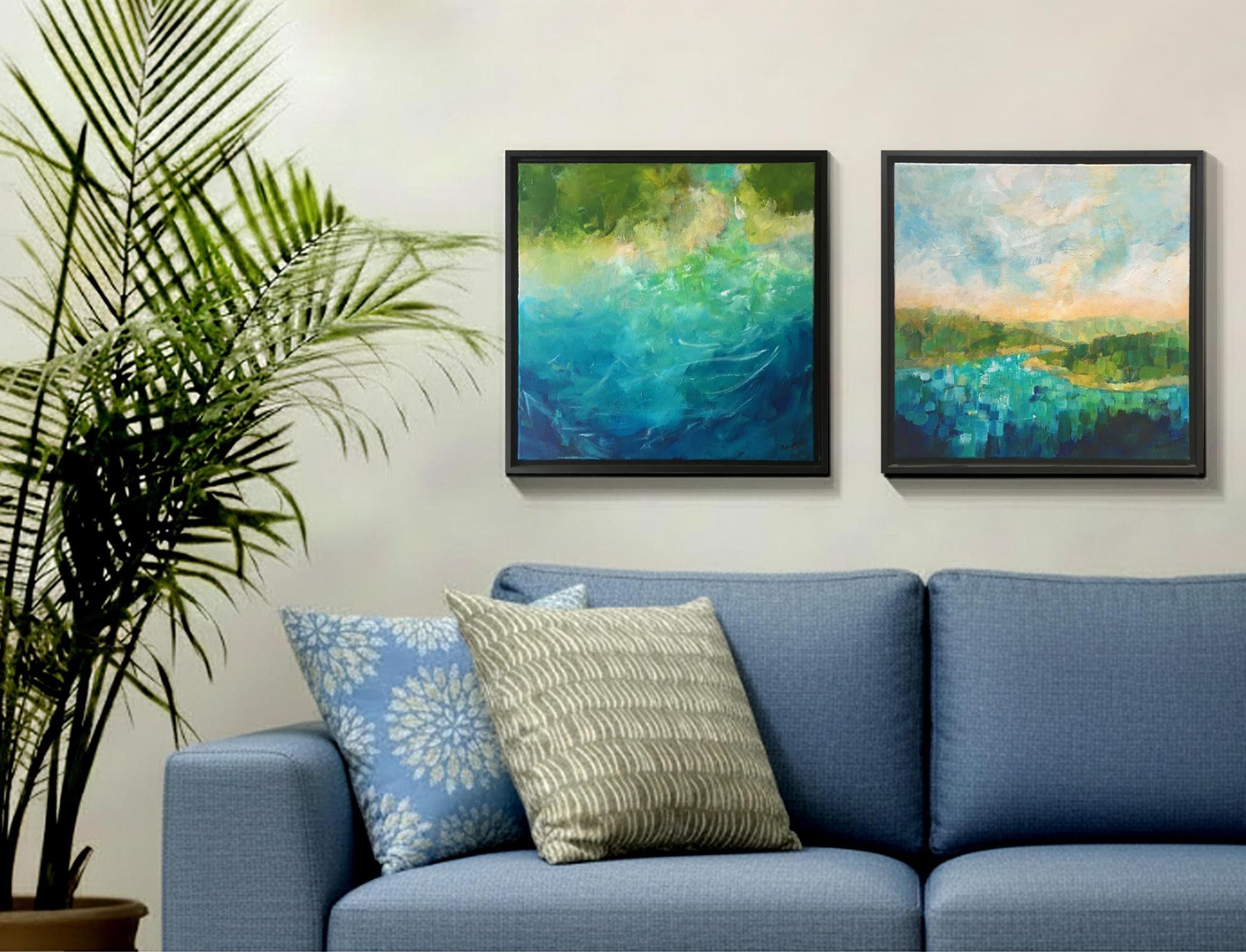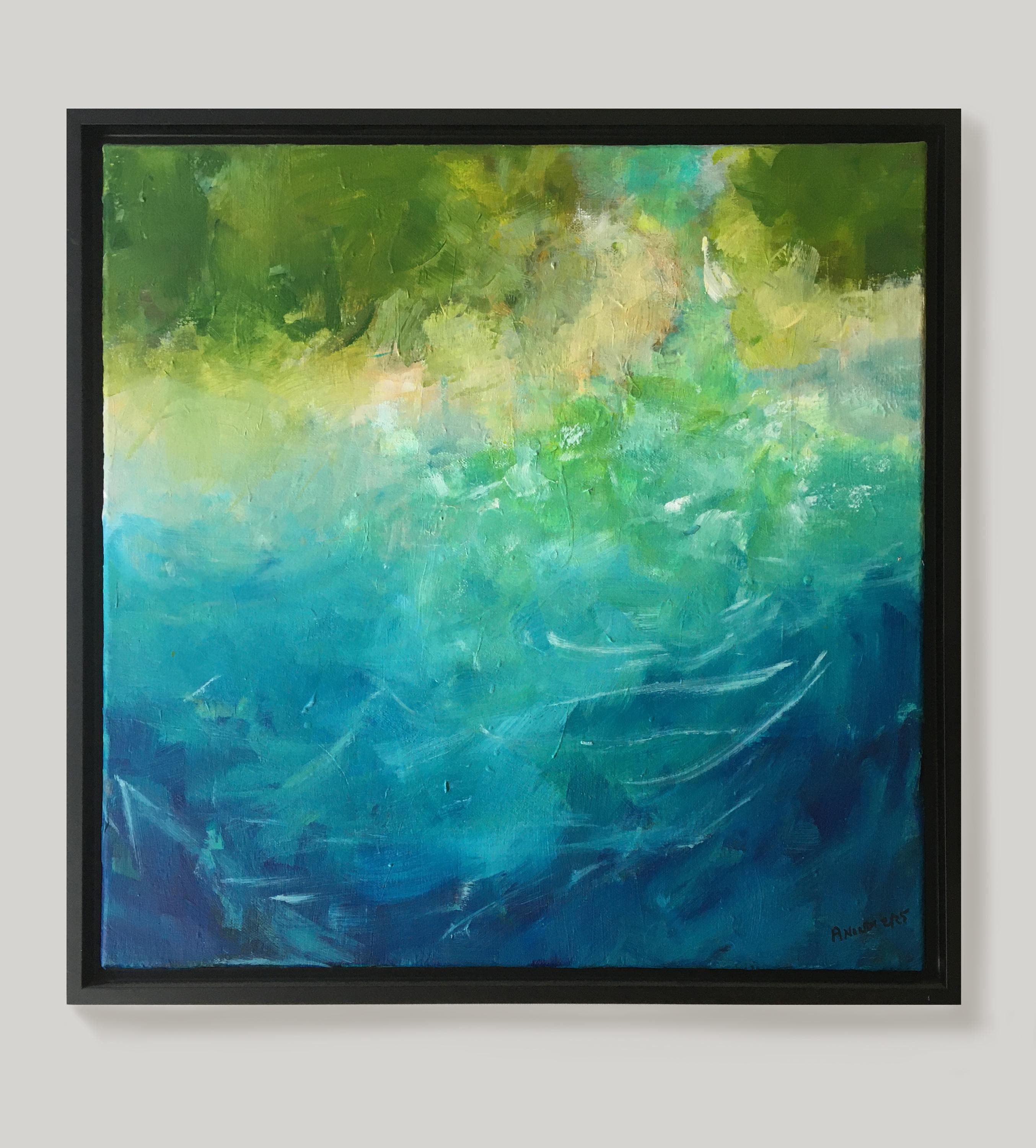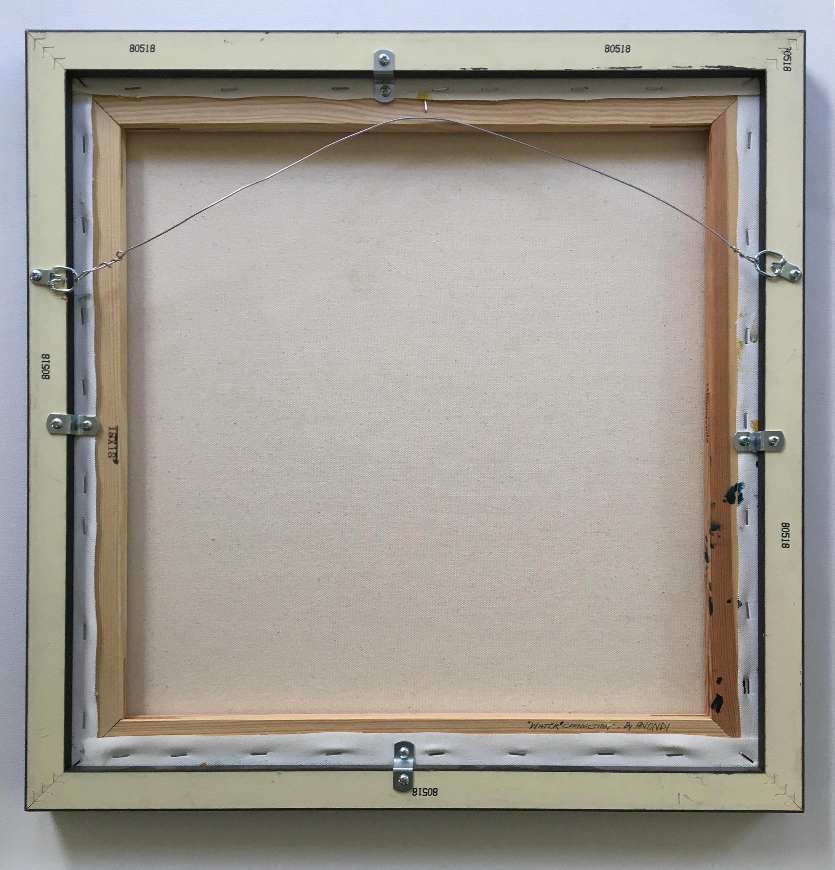 This original painting is an interpretation of my connection to the ocean and the marshes. It's that special place where one is still on land, but at the water's edge. The touches of bright color, the sparkle of white and touches of gold, express the magical feeling of its pull. This painting measures 18" by 18" square, and is shipped framed and ready to hang. Total measurements with the floater style frame are 19.5" by 19.5". Free shipping within the USA.