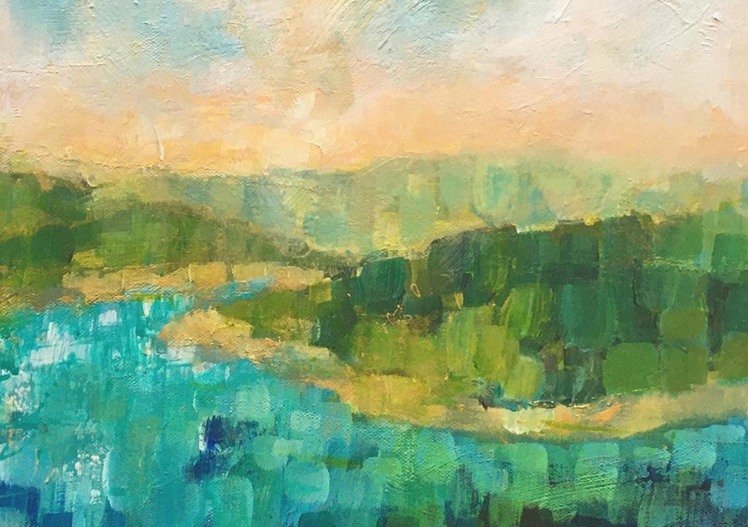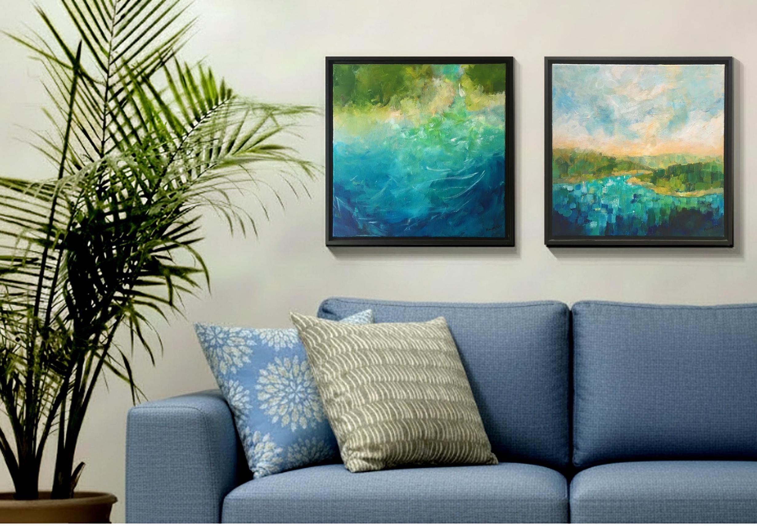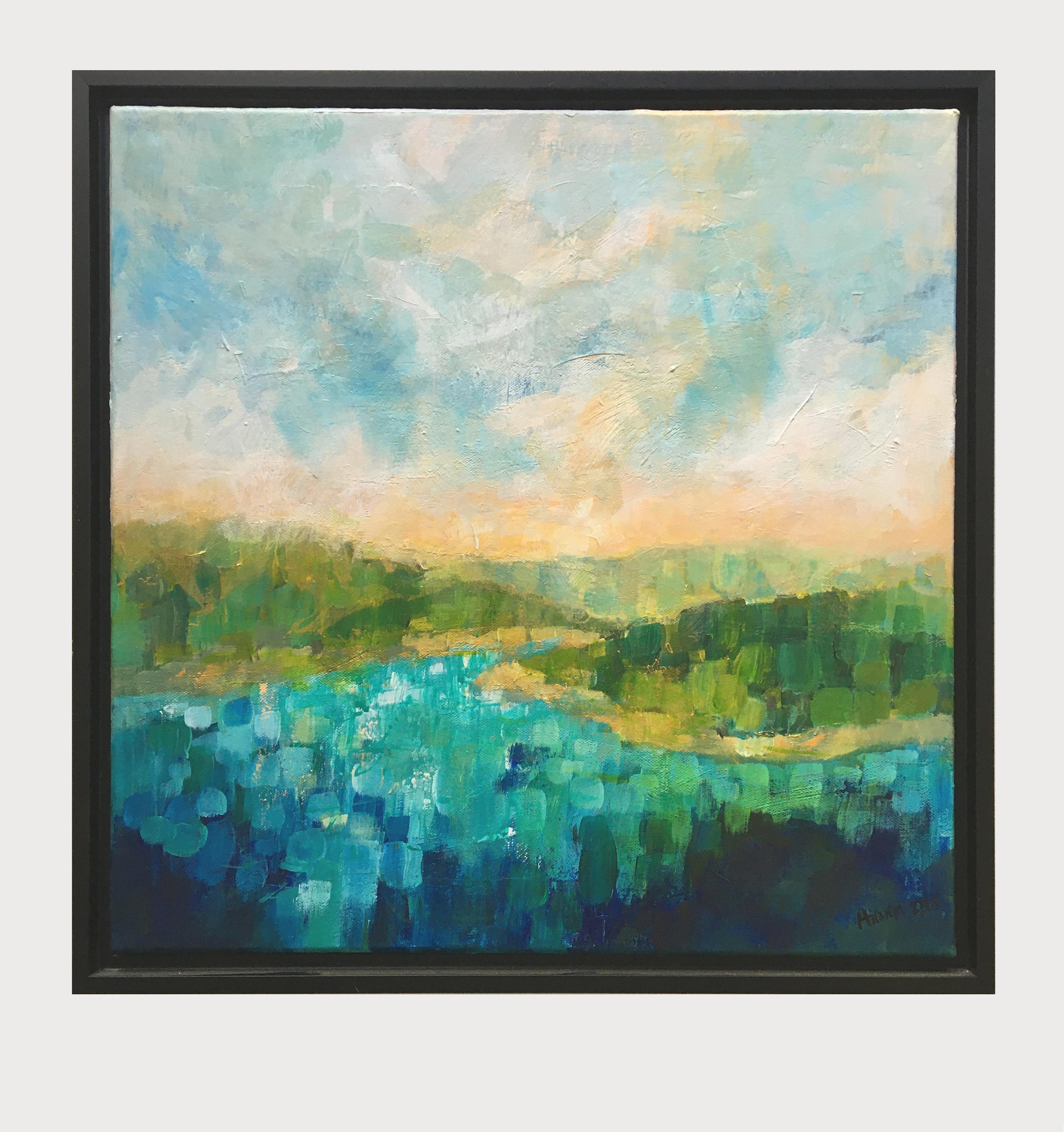 This original painting is a symbolic representation of my journey through life and a search for a place in the world, literally and figuratively. It depicts a special place, near the water's edge. I left my birthplace as a teen, so everywhere and nowhere are home. The touches of bright color, the sparkle of white and touches of gold, express a feeling of joy and hope. This painting measures 18" by 18" square, and is shipped framed and ready to hang. Total measurements with the floater style frame are 19.5" by 19.5". Free shipping within the USA.
